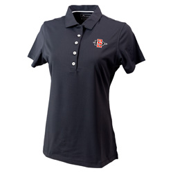 A women's polo fit with four-way stretch, UPF 50+ sun protection, moisture-wicking and odor-control, featuring the Interlocking SD Spear embroidered on the left chest.