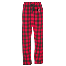 Red and black loose-fit flannel pants with drawstring elastic waistband, featuring the interlocking SD Spear logo screen printed on the left leg.